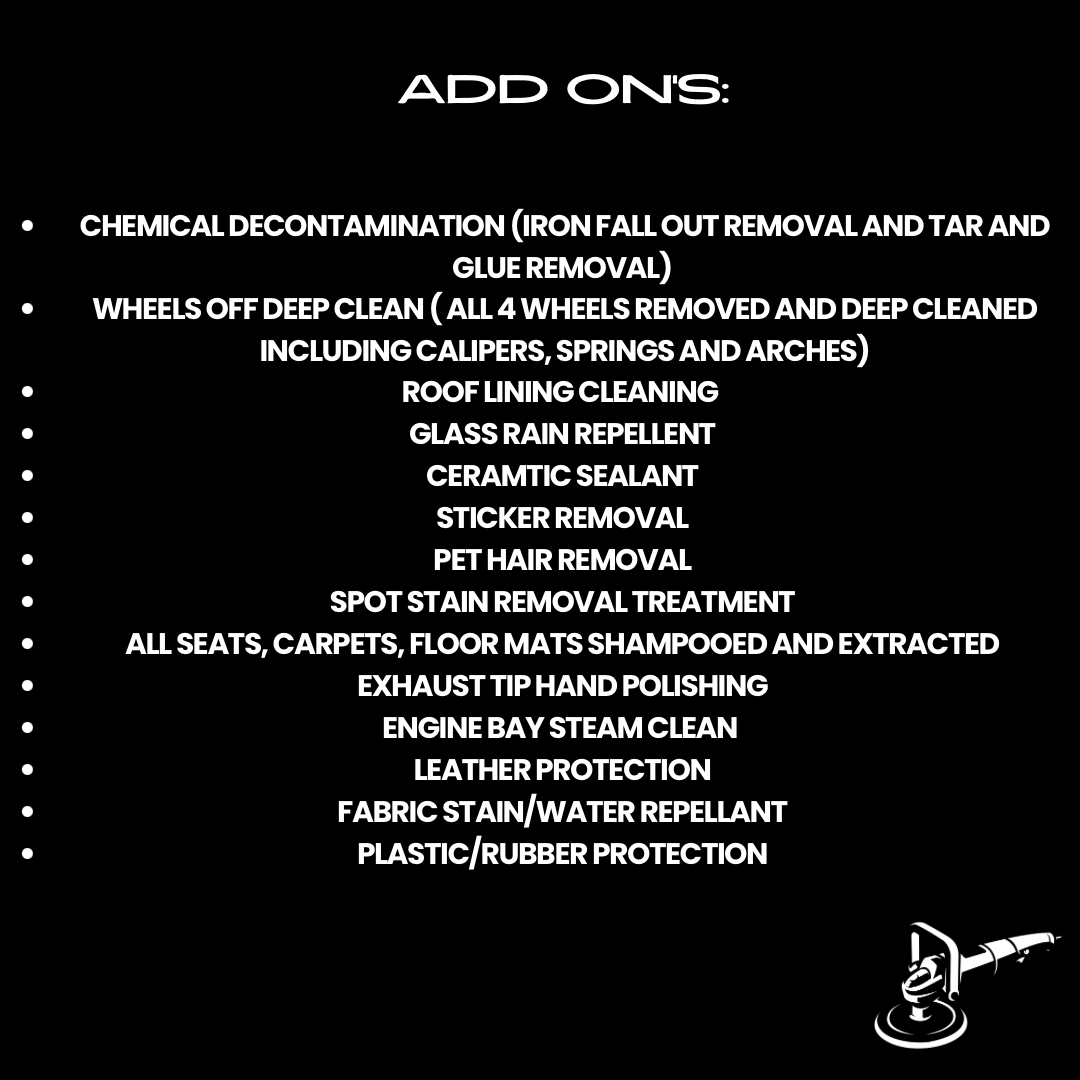 If your exterior is clean but your interior needs a freshen up then this is the service you're after. Professional-grade interior detail to achieve a clean, rejuvenated experience.